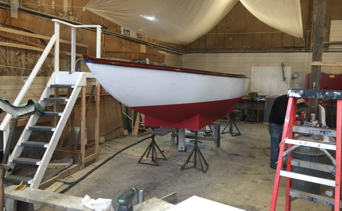 We first stripped and splined the hull to make it rigid.  The hull was then cut open and a platform/cradle was constructed to support the hull.  The opening was framed up and the interior edge was finished with the same arc as the toe rail.  The deck was faired and a new layer of dynel was applied.  The boat was completely refinished with new paint and varnish and then transported by trailer to Massachusetts.